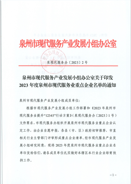 博亞公司被認定為“2023年度泉州市現代服務業重點企業”!
