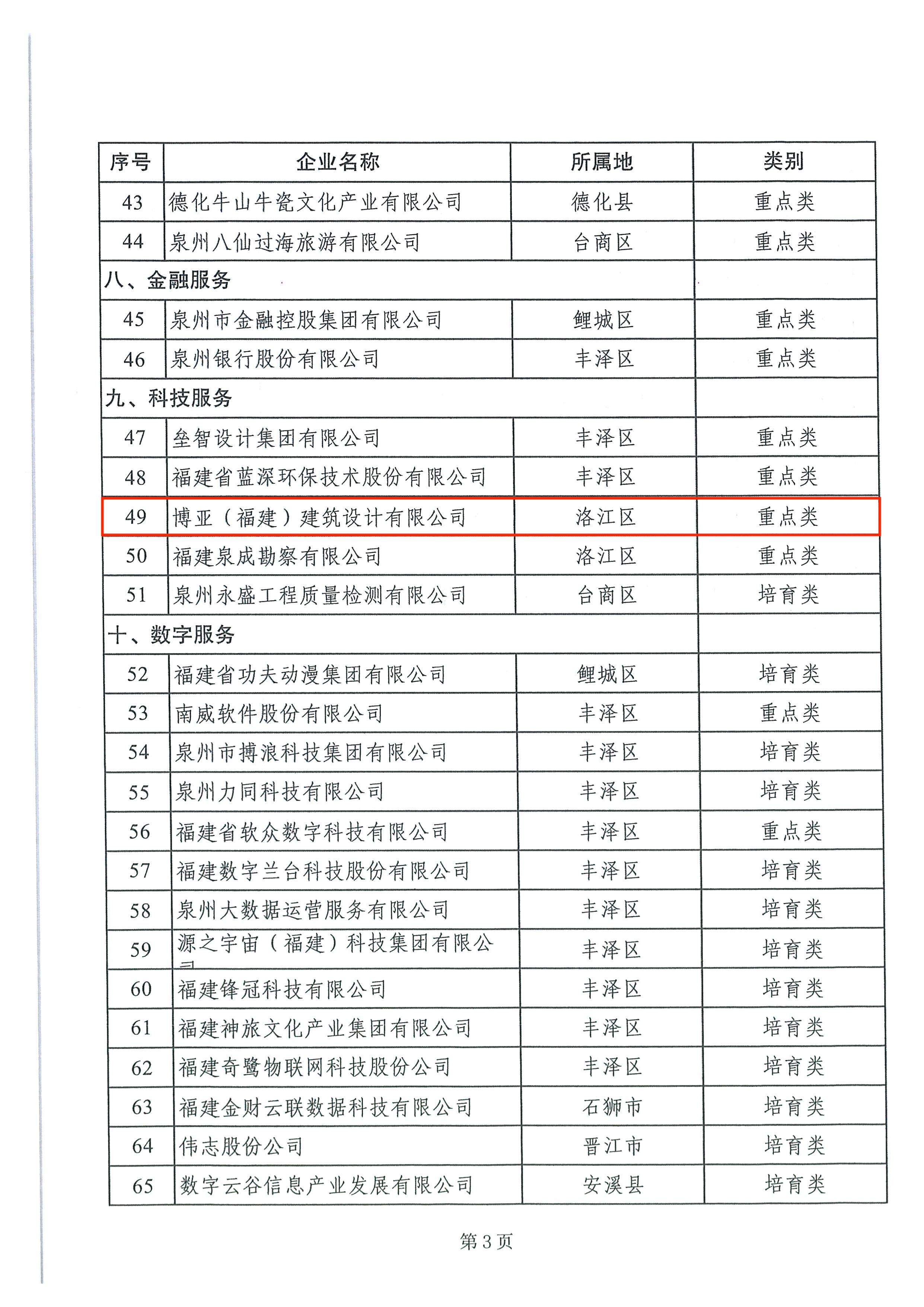 2023年7月12日,經洛江區政府初審推薦、行業主管部門評審和泉州市現代服務產業發展小組研究,公布了2023年度泉州市現代服務業重點企業名單,博亞(福建)建筑設計有限公司獲泉州市“現代服務業重點企業”認定。這是公司繼2021年獲“泉州市第三產業龍頭企業”、2022年獲“泉州市建筑業準龍頭企業”稱號后,再一次獲得市政府和行業主管部門的肯定。