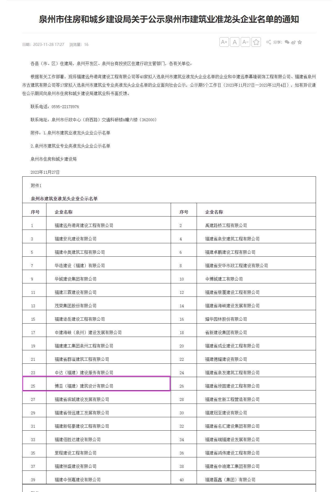 2023年11月28日,泉州住建局官網(wǎng)發(fā)布《泉州市住房和城鄉(xiāng)建設(shè)局關(guān)于公示泉州市建筑業(yè)準(zhǔn)龍頭企業(yè)名單的通知》,公布了40家擬入選泉州市建筑業(yè)準(zhǔn)龍頭企業(yè)名單,博亞(福建)建筑設(shè)計(jì)有限公司名列在榜。這是繼2022年博亞公司榮獲“泉州市建筑業(yè)準(zhǔn)龍頭企業(yè)”稱號(hào)后再次成功入選。作為福建省第二家具有工程建設(shè)全過(guò)程設(shè)計(jì)和施工總承包、工程監(jiān)理資質(zhì)的綜合性建筑企業(yè),能夠再次入選“泉州市建筑業(yè)準(zhǔn)龍頭企業(yè)”,既是市政府及行業(yè)主管部門對(duì)公司在設(shè)計(jì)、施工及全過(guò)程等業(yè)務(wù)能力的肯定,同時(shí)也是對(duì)公司穩(wěn)健發(fā)展的鞭策與激勵(lì)。會(huì)當(dāng)凌絕頂,一覽眾山小!博亞公司將繼續(xù)砥礪前行、踔厲奮發(fā),為泉州市建筑業(yè)全方位高質(zhì)量發(fā)展添磚加瓦。