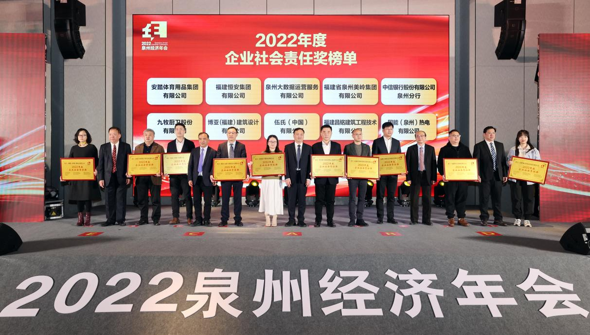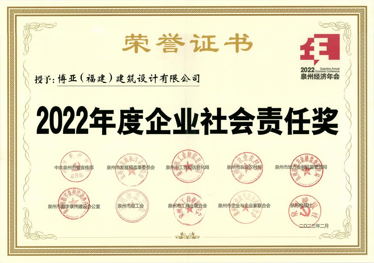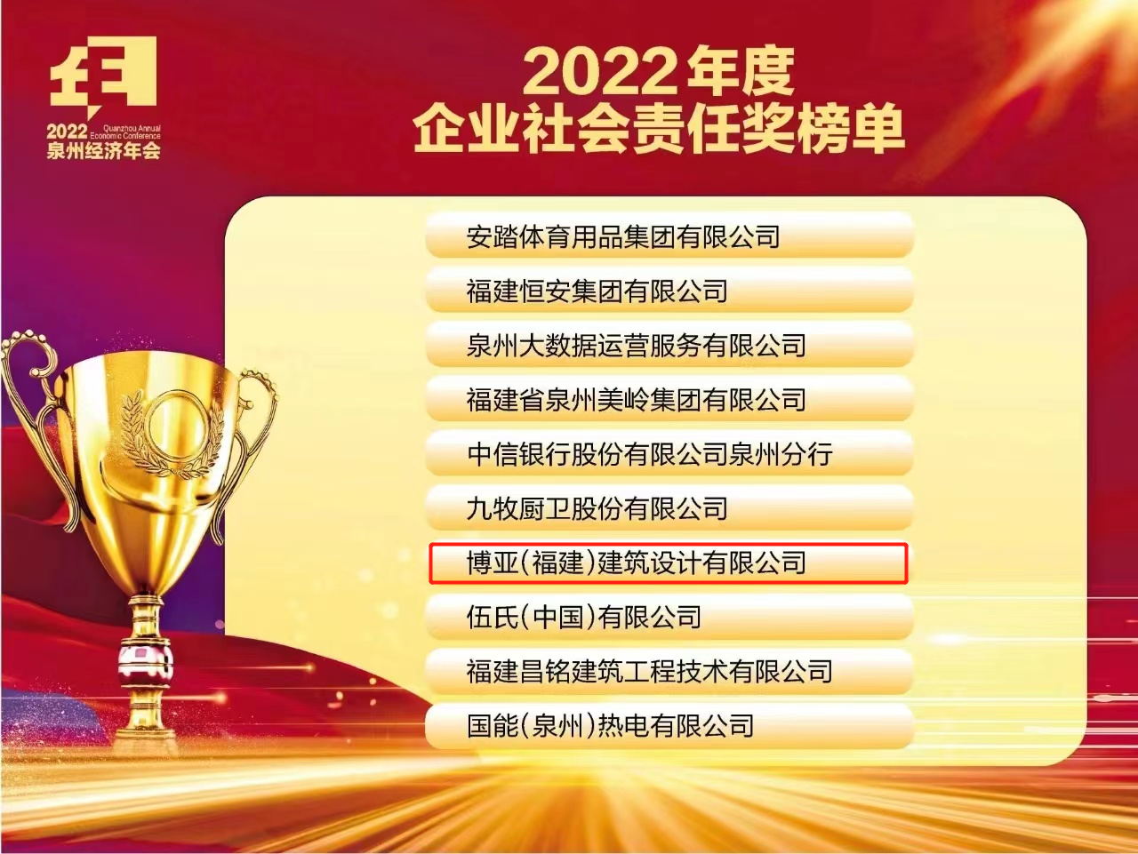 “花開刺桐,春色錦繡”。2月16日下午,由泉州市委宣傳部、市發改委、市工信局、市農業農村局、市金融監管局、市數字辦、市總工會、市工商聯、市企聯及泉州晚報社聯合舉辦的泉州經濟年會盛大召開。博亞(福建)建筑設計有限公榮獲泉州“2022年度企業社會責任獎”。